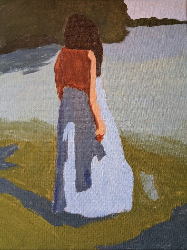 Slivka used Raw Sienna and Cadmium Red for the skin; I used Raw Sienna and Red Oxide. For the clothing shadows, Slivka used a violet with white. I used Liquitex Basics Gray Blue with some white.