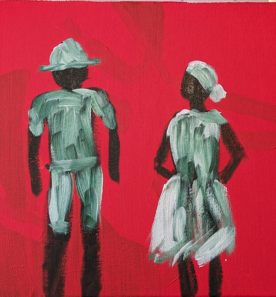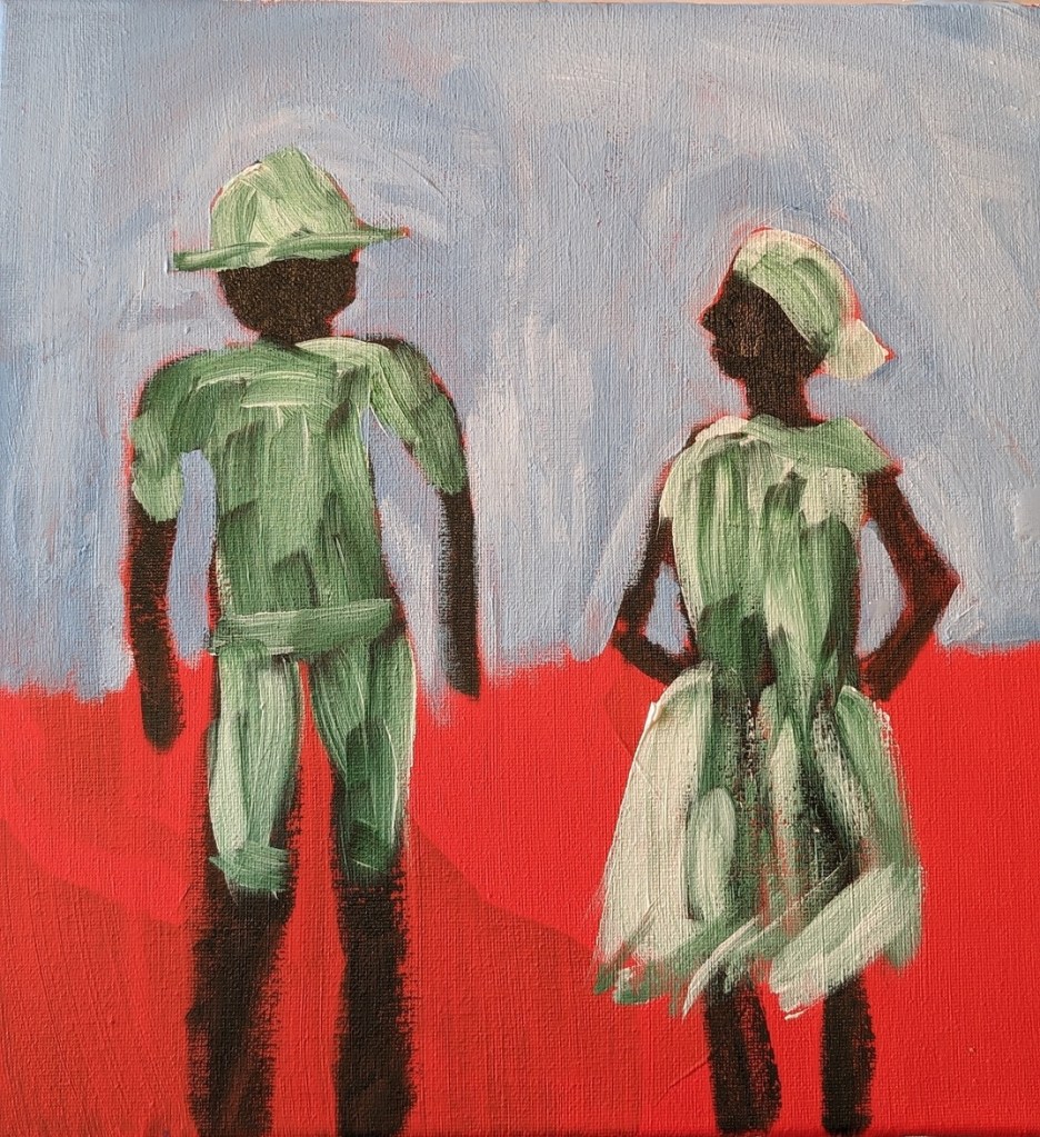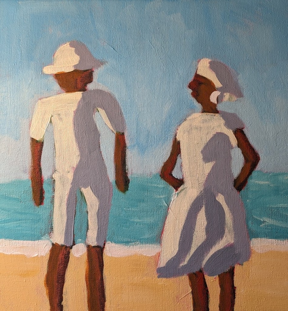 Next was the ocean and the sand. Slivka uses some aqua green and Naples Yellow, respectively. I used Liquitex Basics Turquoise Green and created a kind of “Naples Yellow” by mixing Yellow Ochre with Titanium White. The sun-bright clothing was Titanium White softened with Cadmium Yellow Light Hue.