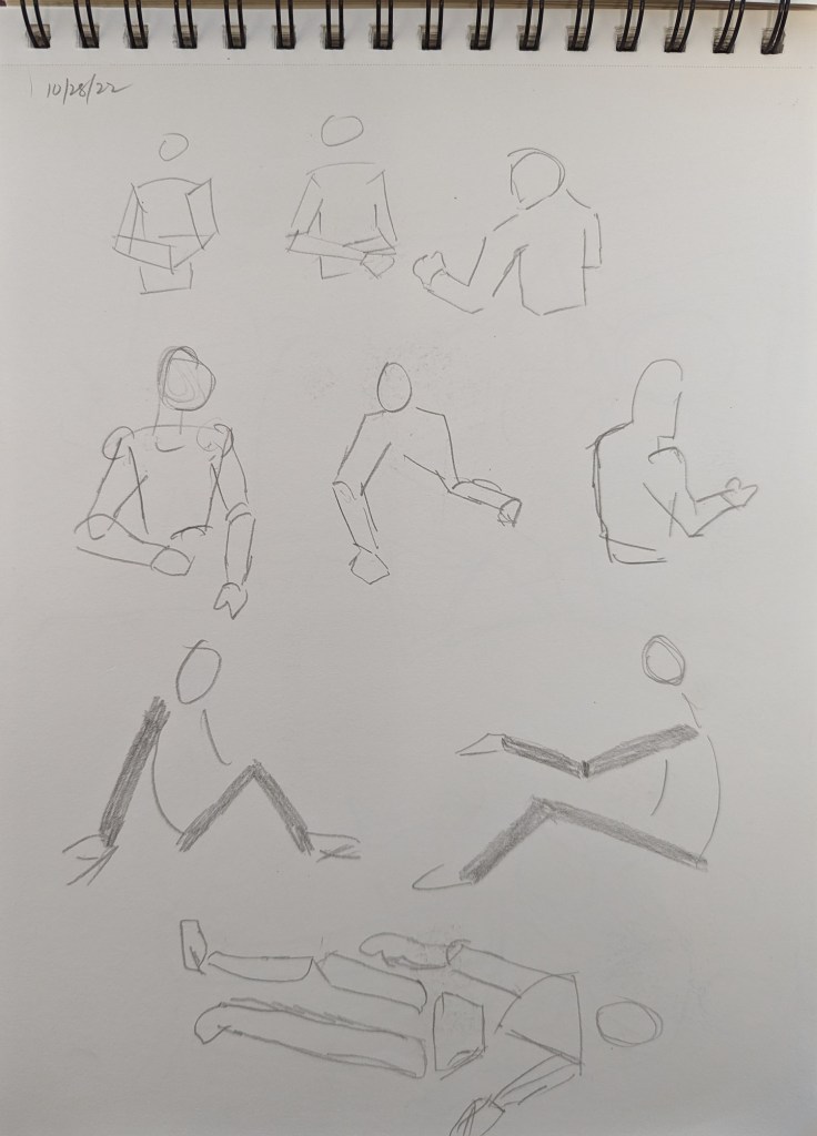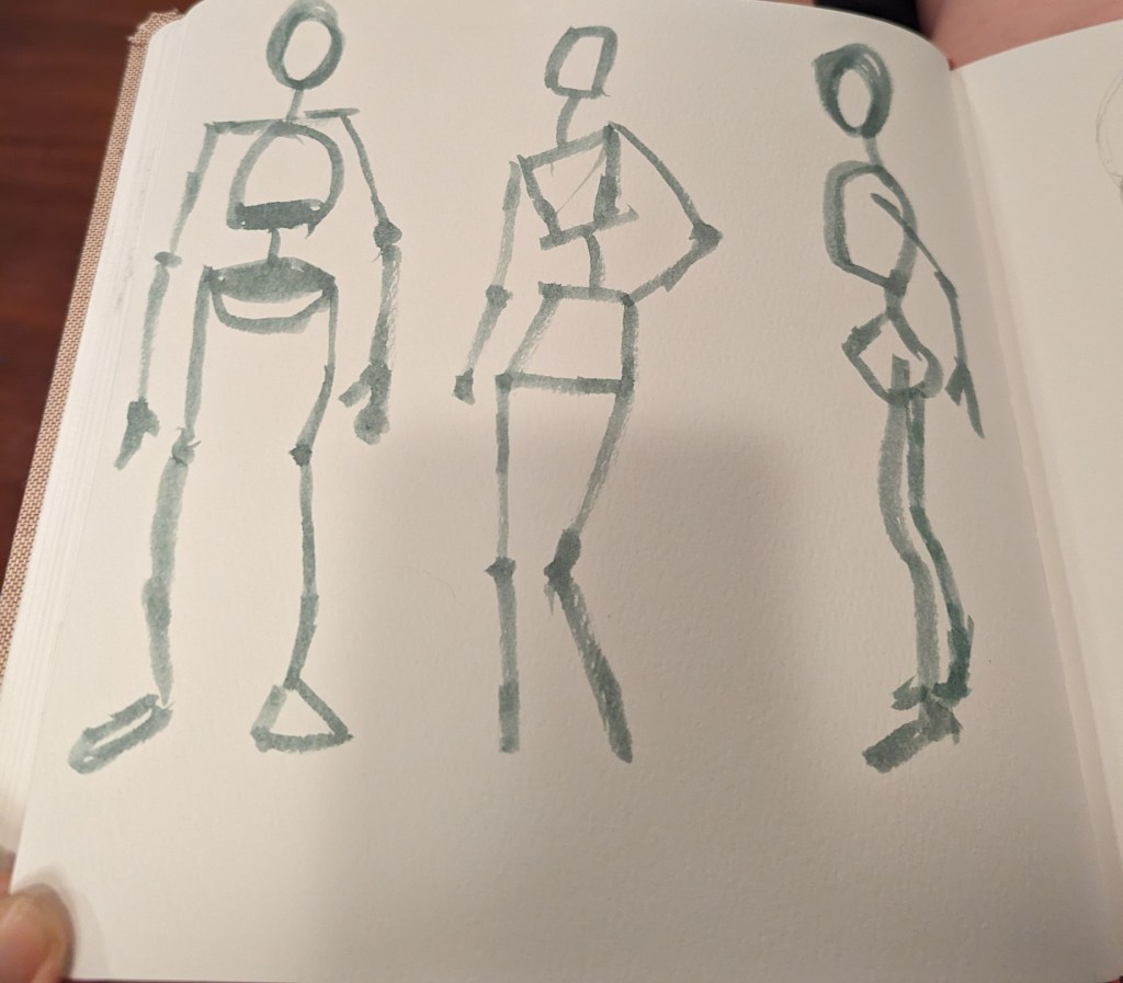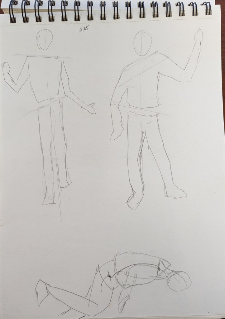 Here’s a few pages from my sketchbook where I was drawing gestural human figures, with the object of maintaining proportions but not focusing on detail. Getting the gist, I guess.