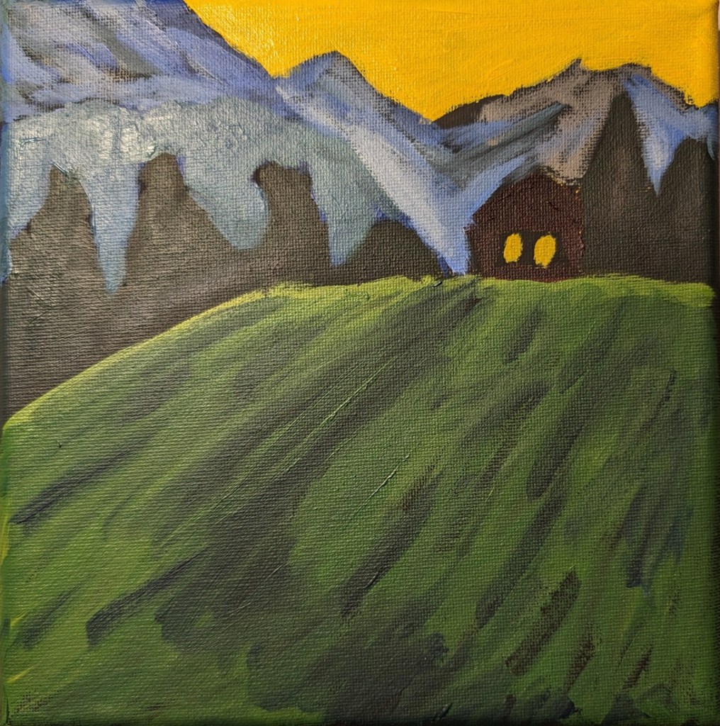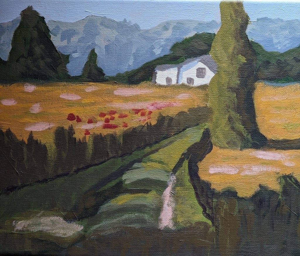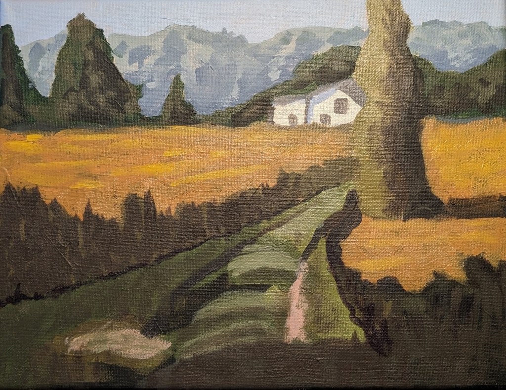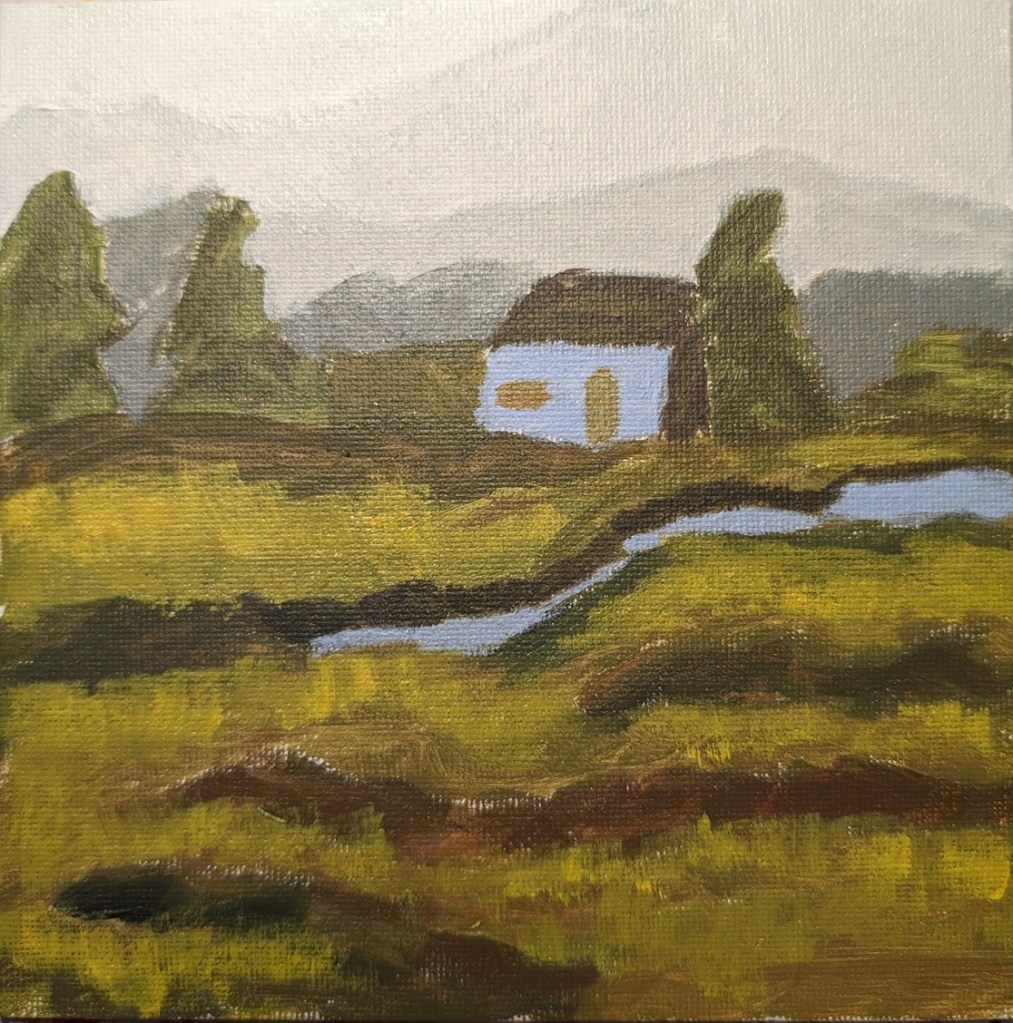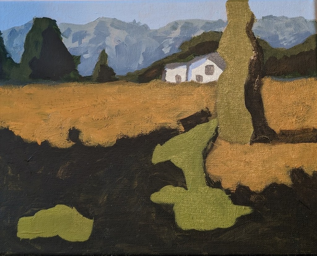 This was week 3 for Jed Dorsey’s Mini Painting Challenge at Acrylic University. It’s based on a picture he took of a hazy morning with the grass full of dew, in an area near his home. It reminds me a lot of the English cottage landscape I did at Paint Coach Patreon.