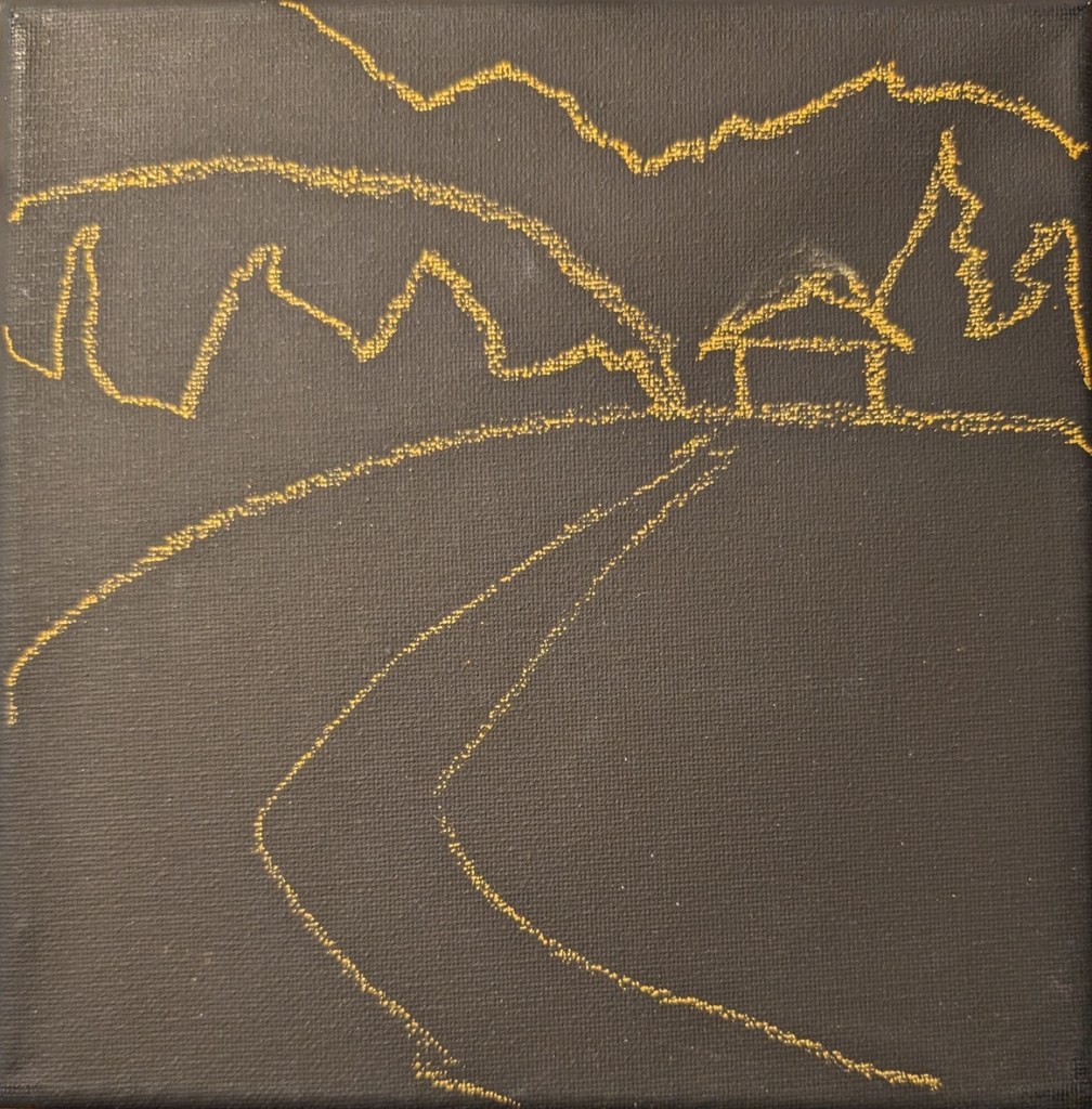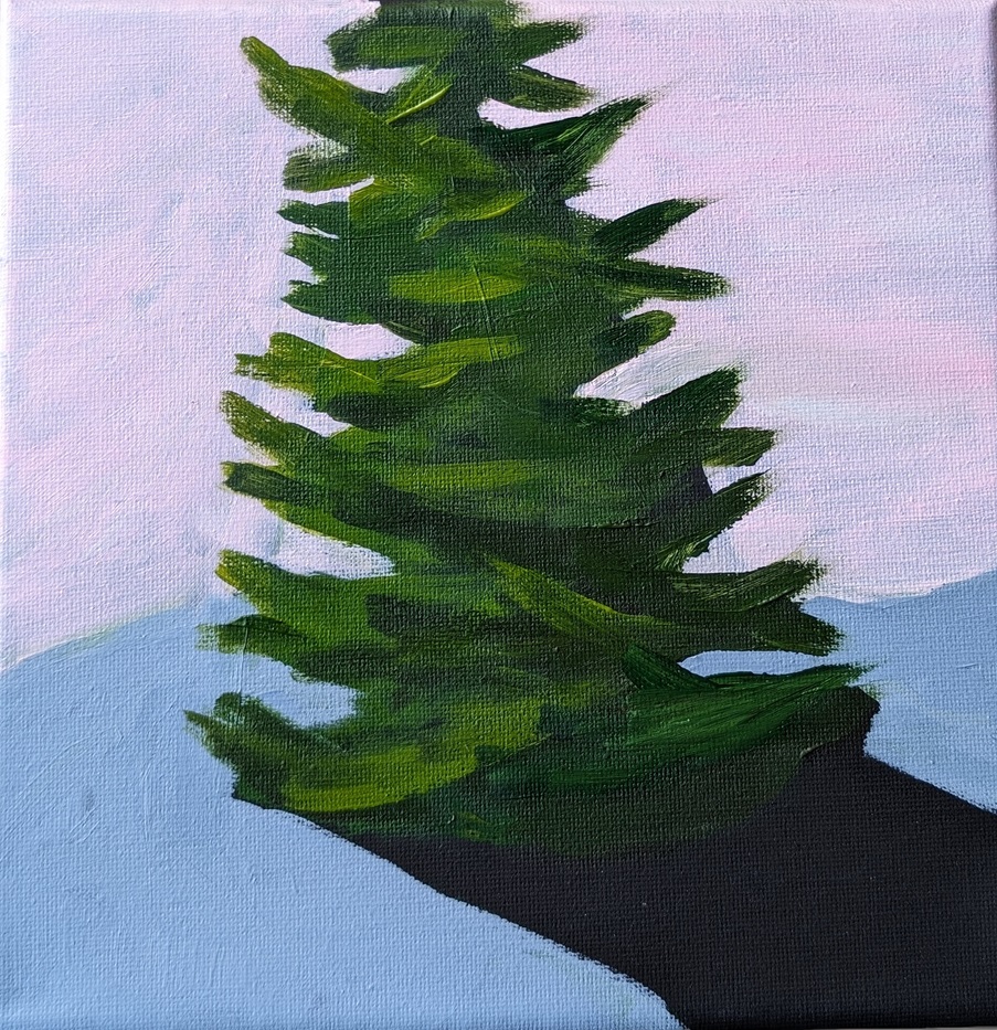 The tree on the right was painted on a 8×8 black stretched canvas. The shadow of the tree is unpainted; I’m just using the black of the canvas.