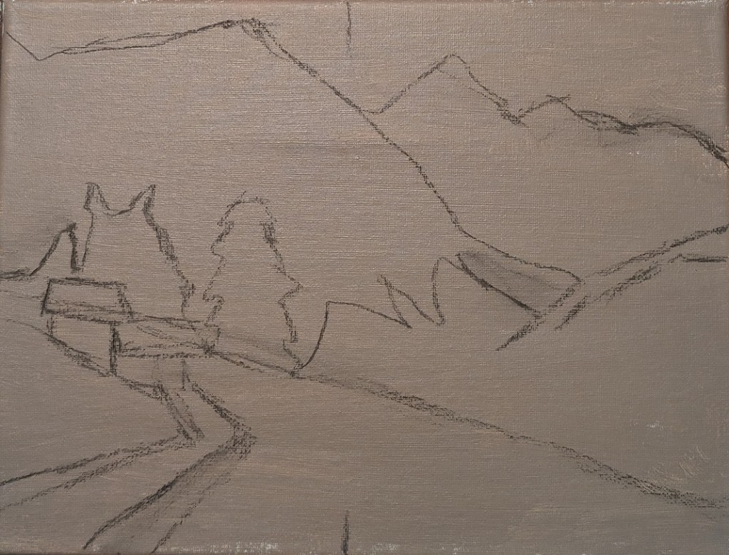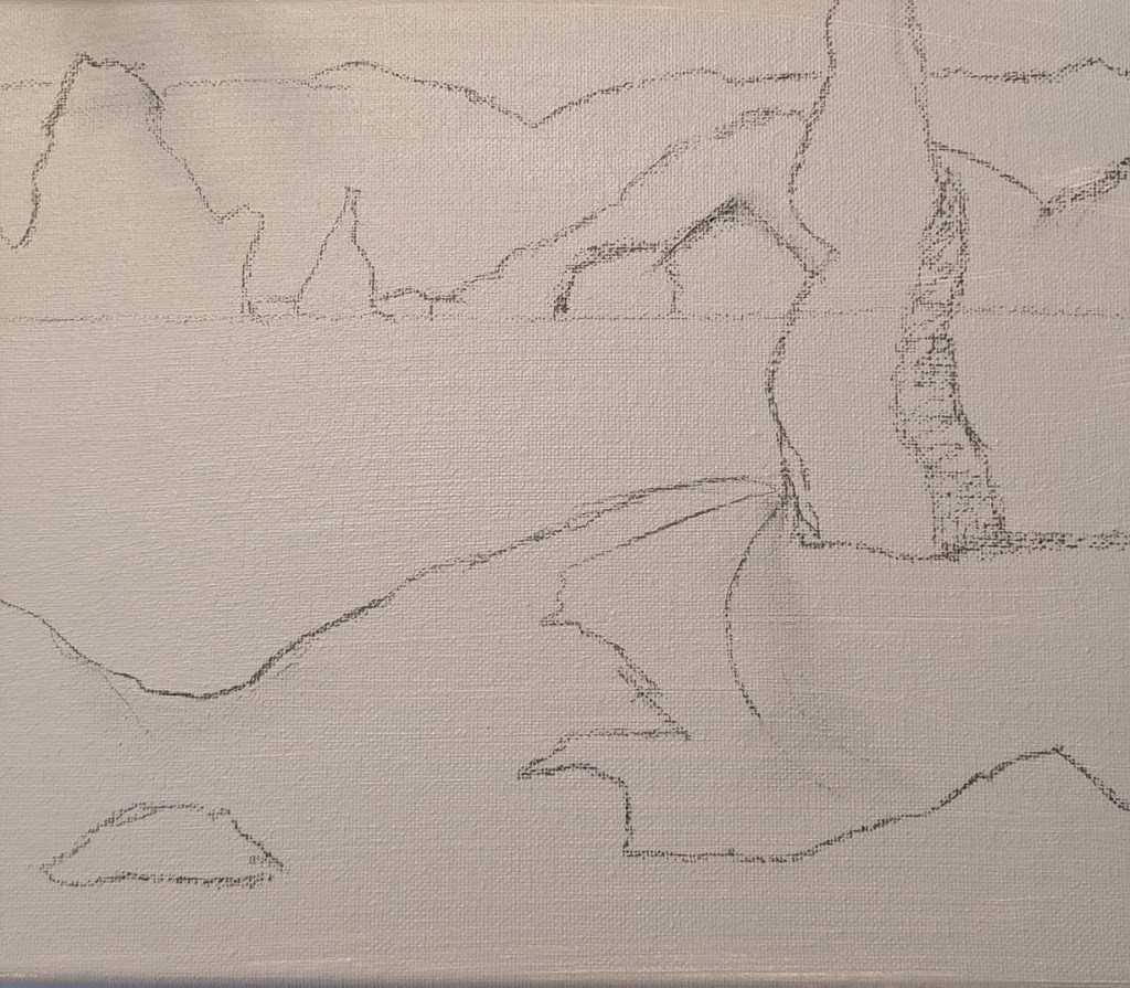 This one is on a 9×12 canvas, toned in Pale Umber, and sketched out in charcoal — rather than painted, because I’ve been watching the World Series, lol.