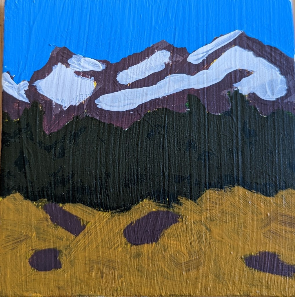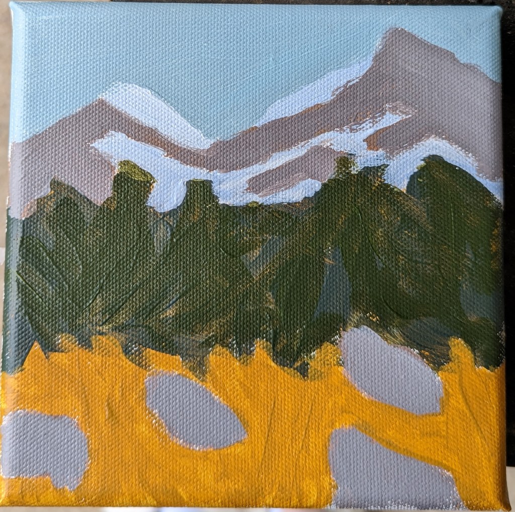 My original 5×5 painting of a mountain landscape, based on Mark Nelson’s “Learn to Paint in Acrylics with 50 Small Paintings: Pick up the skills * Put on the paint * Hang up your art” did not adequately reflect, in my opinion, atmospheric perspective. The mountain was unrealistically brown, the snow was unrealistically white, and the sky unrealistically blue!
