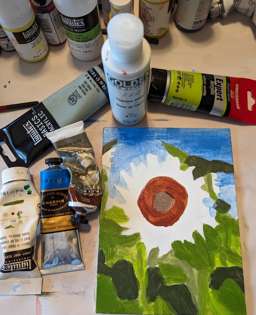 This acrylic painting on a 6×8 canvas is inspired by an image by Dioptrius from Pixabay. I’ve included a work-in-progress photo of the work surrounded by the paint colors I used.