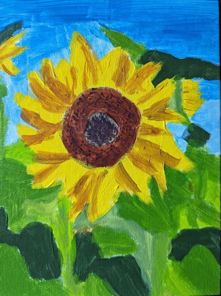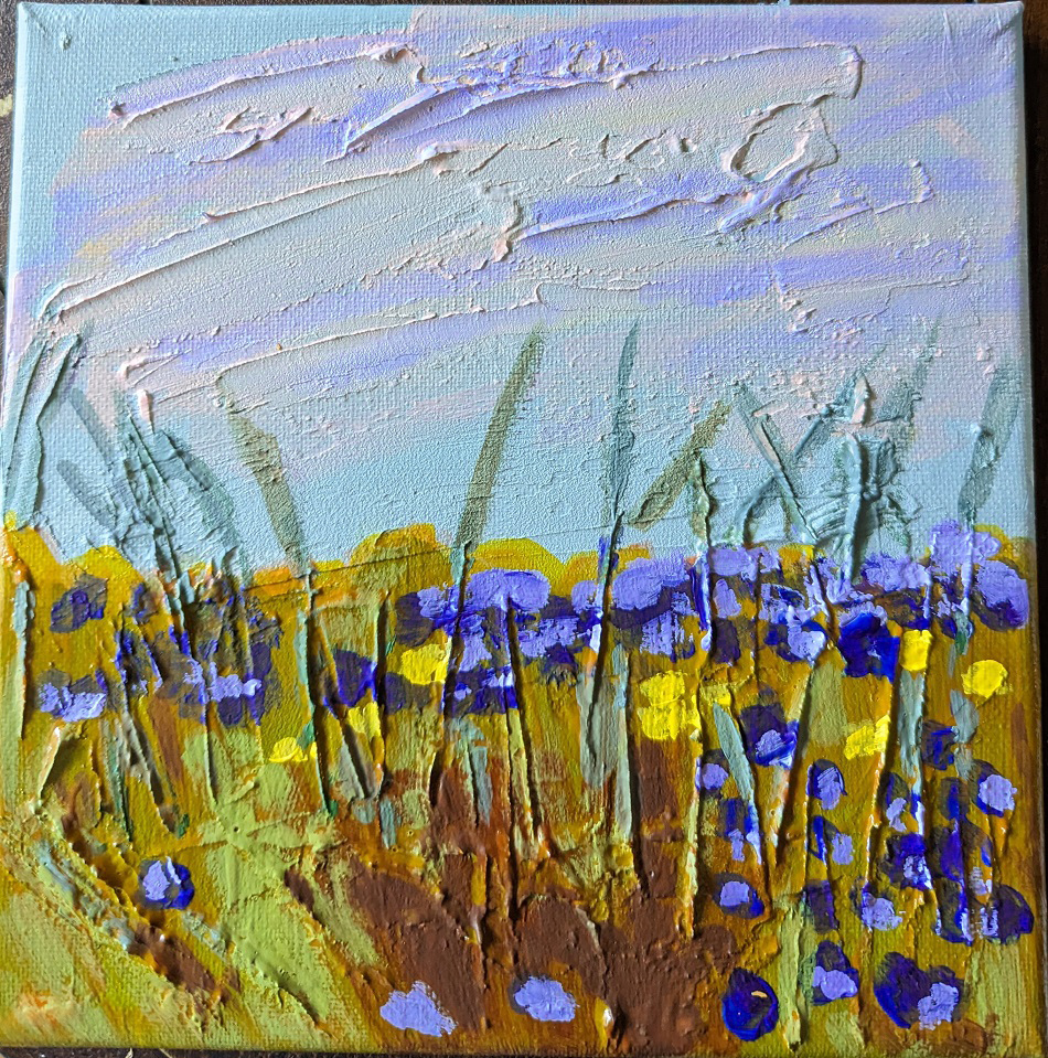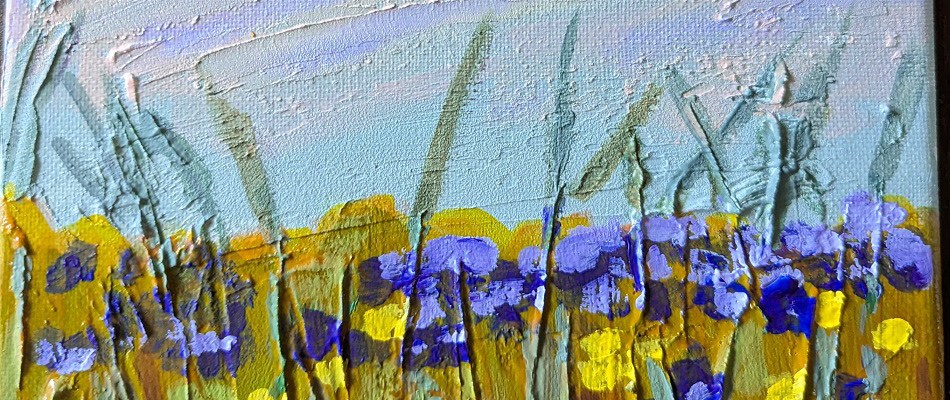 Next I painted the flowers, using Dioxazine Purple with some Titanium White, some yellow flowers, and highlighted the stems with Gray Green, yellow, and Burnt Sienna. I retouched the grassy area with some green. Then I added some of the Dioxazine Purple mixture to the clouds in the sky, and called it a day.