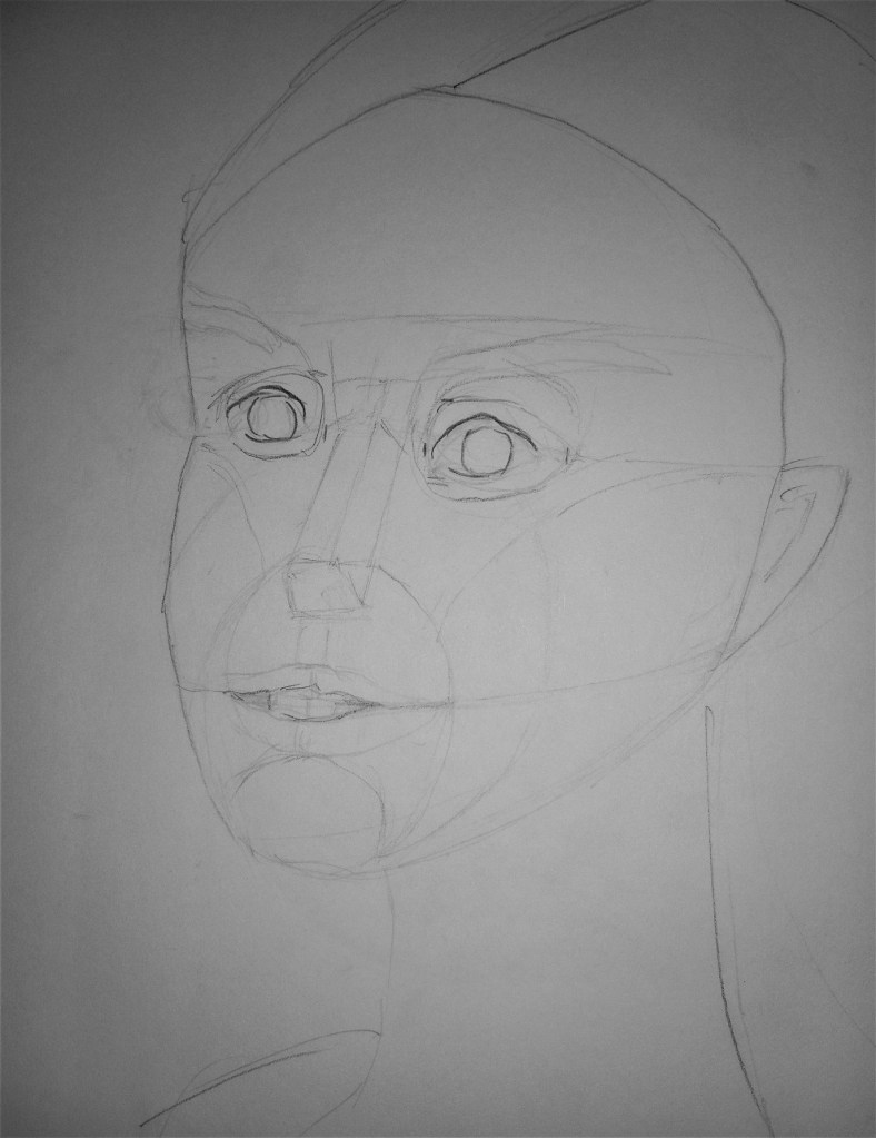 This is the first round — no detail, no shading — of a head based on the Reilly method, and as homework for the charcoal portraits online class I’m taking.