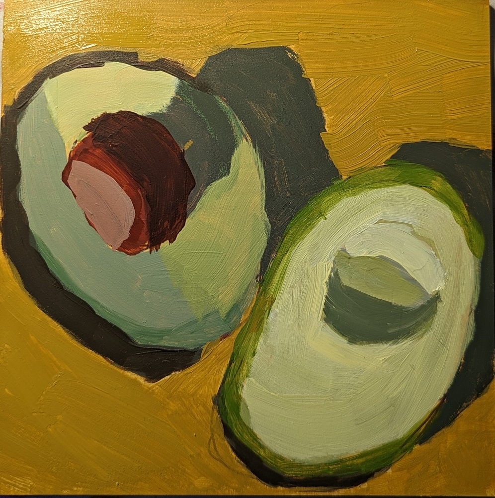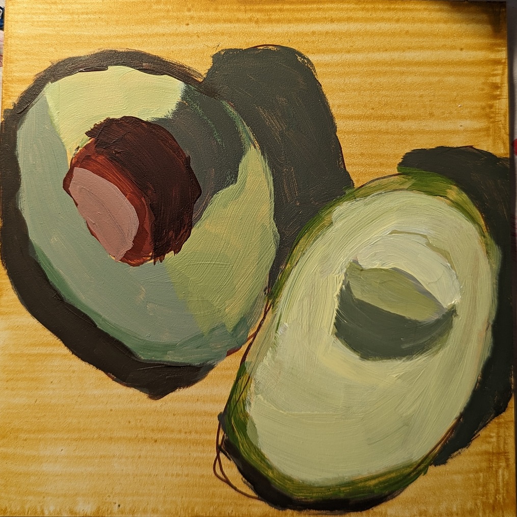 I have two pear paintings which I did side by side: one is on gessoboard (which I mostly haven’t used so far) and one is an 8×8 “super saver” cotton canvas from Dick Blick. I find the paint slips and slides more on the gessoboard; something I find irritating in my beginner-ness.