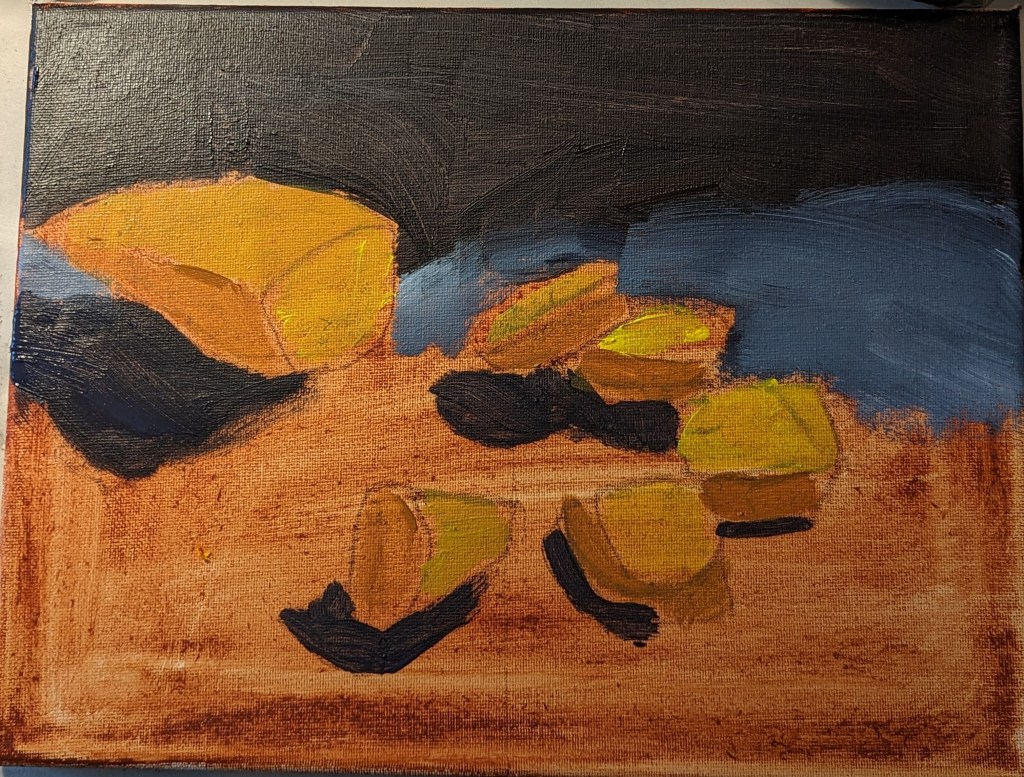 This is a still life from one of the Beginner “Painting Paths” offered on Patreon by the Paint Coach. The idea is to block out your darks and lights first, and use that as a value “road map” in completing the painting, gradually adding more detail.