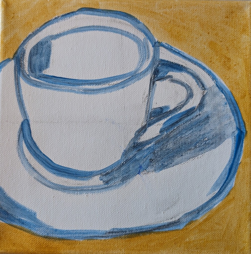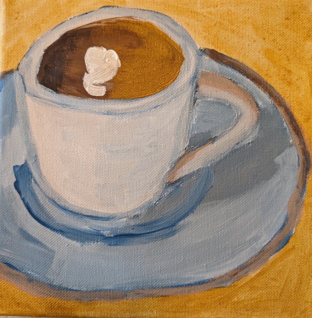 I painted this cup of coffee, based on a photo by Jeremy Yap on Unsplash, on an 8×8 canvas, with cerulean blue as the primary blue.
