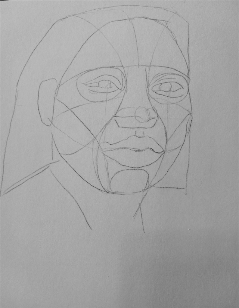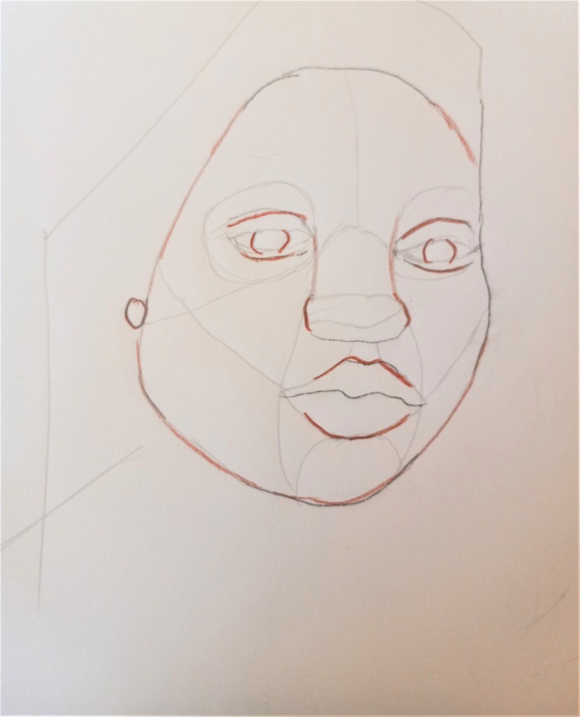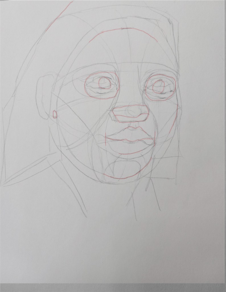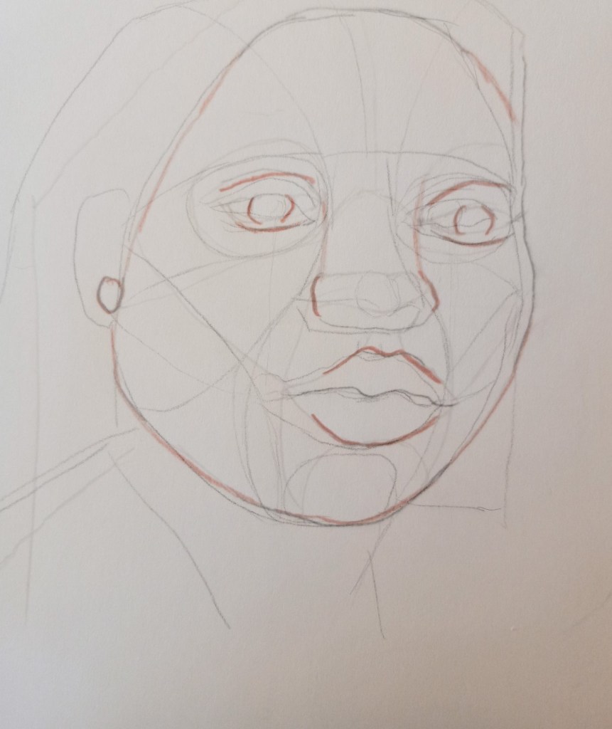 Here I was drawing free-hand against a traced copy of the reference photo (by Clarke Sanders on Unsplash). I merged the free-hand and the traced to see how far (or how close) I was to actual proportions. I added red pencil to the free-hand version so the lines would show up better in comparison.